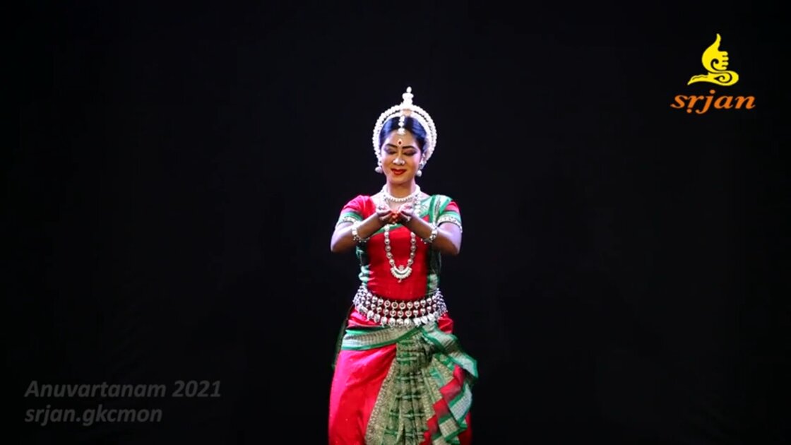 Mangalacharan commences with an invocation to Lord Jagannath followed by a salutation to the Mother Earth, a Shloka Vandana, and the Trikhandi Pranam. In this prayer, Shantakaram Bhujagashayanam, the dancer bows to Lord Vishnu, the supreme being and the master of the universe, who is ever peaceful and supports the entire universe. He is the husband of Goddess Lakshmi, and the destroyer of fear.